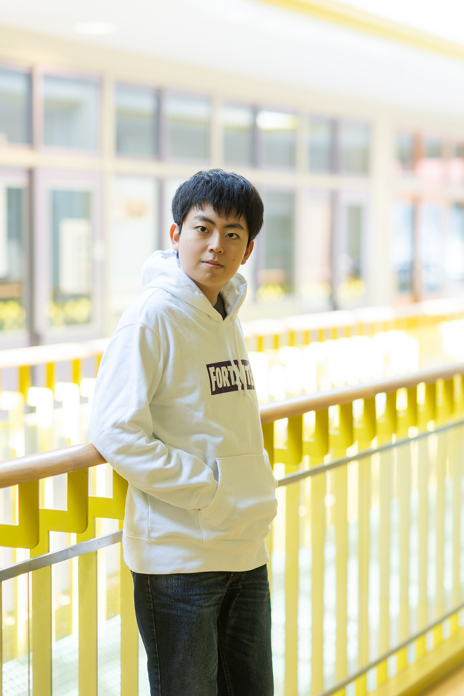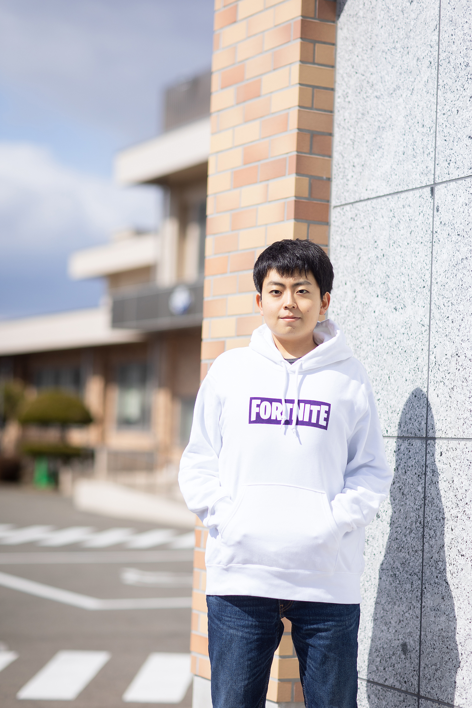 3月、大会から2か月が過ぎたこの日。撮影場所である学校に、だけども彼は制服ではなく、ジーンズとパーカーでやって来た。まだ少し弱々しい春の日差しに照らされた、白いパーカーのその胸には、「FORTNITE」の文字が記されていた。